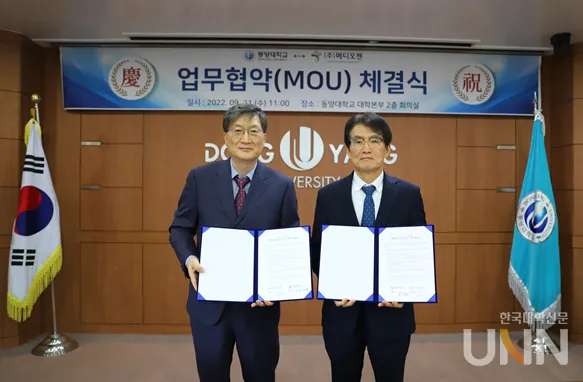 동양대, ㈜메디오젠과 업무협약 체결 mediogenweb 9월 23, 2022 [한국대학신문 이정환 기자] 동양대학교 (총장 이하운)은 21일 ㈜메디오젠(회장 백남수)과 상생협력을 위한 업무협약을 체결했다고 밝혔다. 협약식에는 이하운 동양대 총장과 ㈜메디오젠