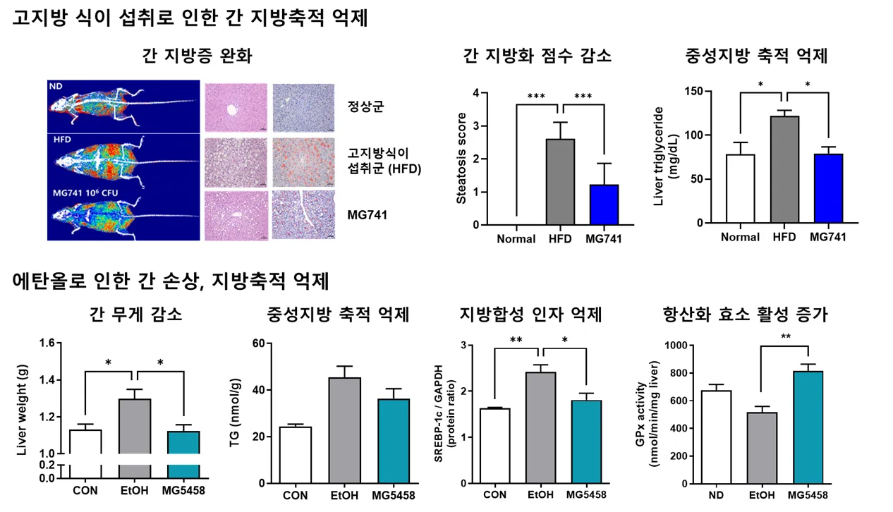 품목 구성: 알콜성 지방간 개선 특허 1종 및 비알콜성 지방간 개선 특허 1종 포함 7종 혼합유산균